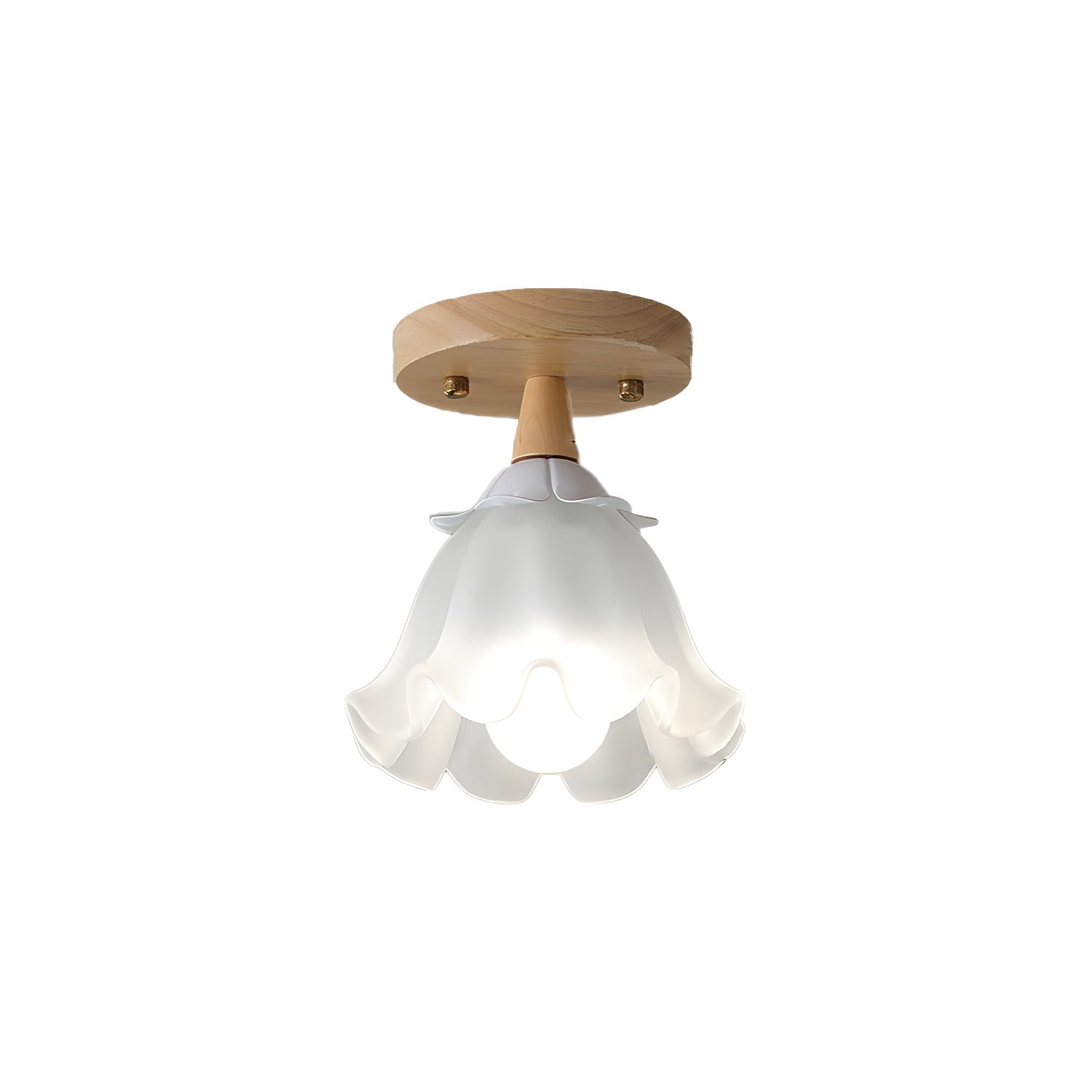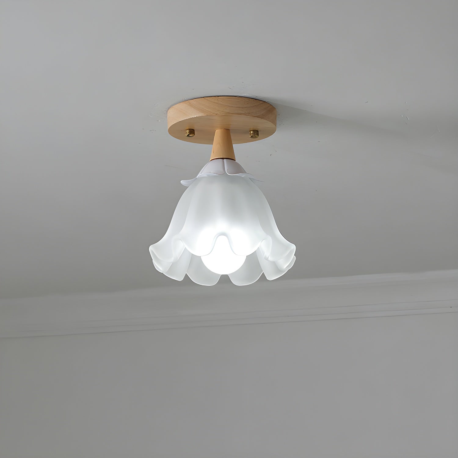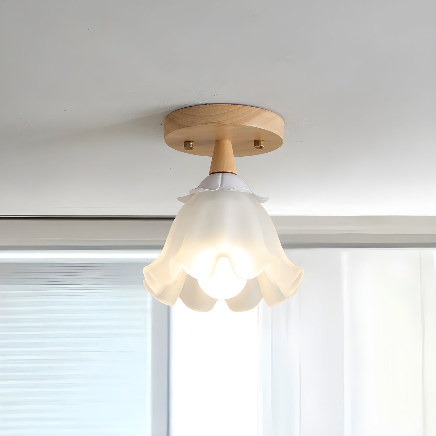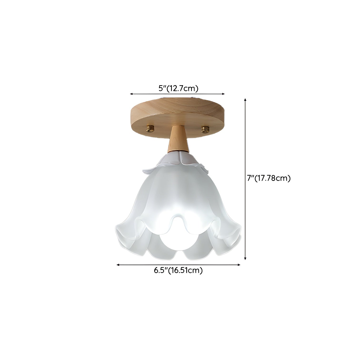 Natural Wood Semi-Flush Mount Ceiling Light with White Glass Bowl Shade