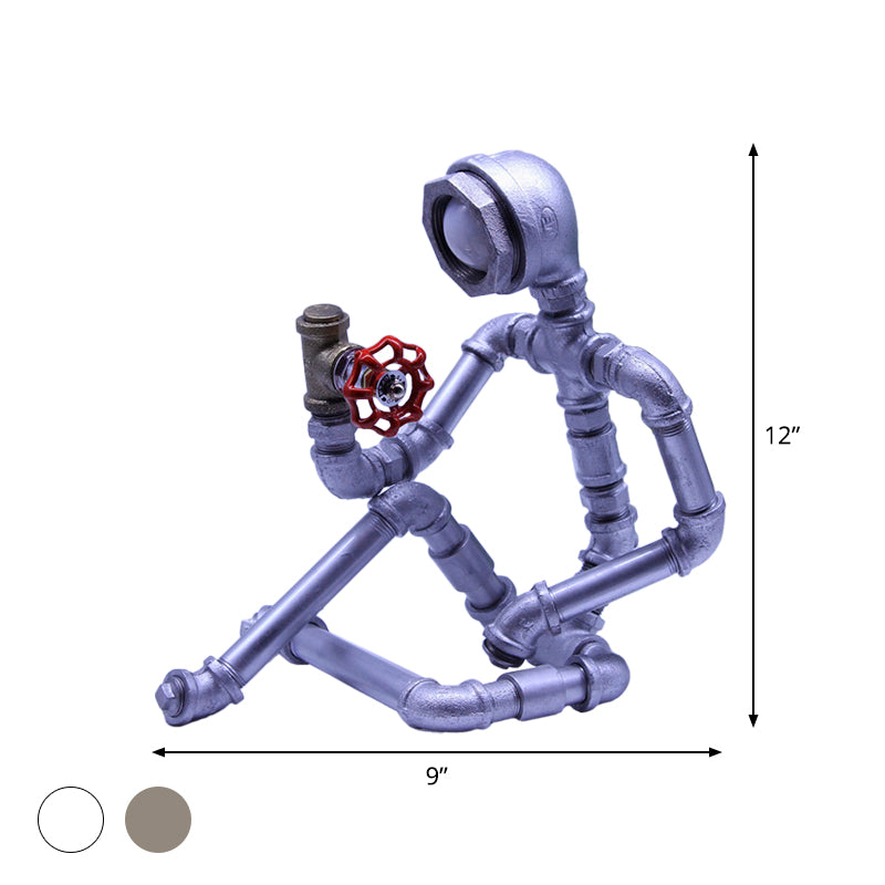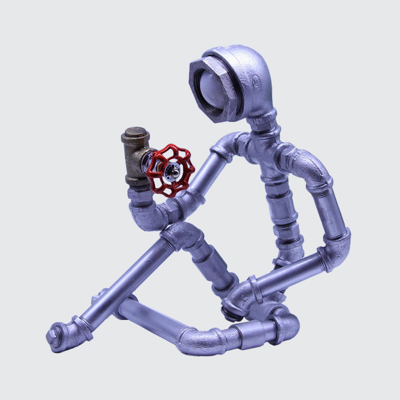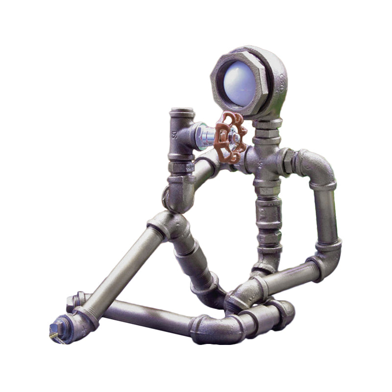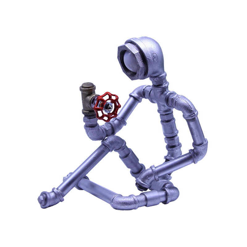 1 Bulb Nightstand Light Industrial Iron Pipe Man Table Lamp in Silver/Bronze with Red Valve Rotating Switch Clearhalo 'Lamps' 'Table Lamps' Lighting' 1950115