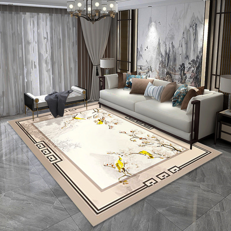 Chic Bird and Flower Rug Multi Color Asian Carpet Polyester Non-Slip Backing Pet-Friendly Washable Rug for Family Room