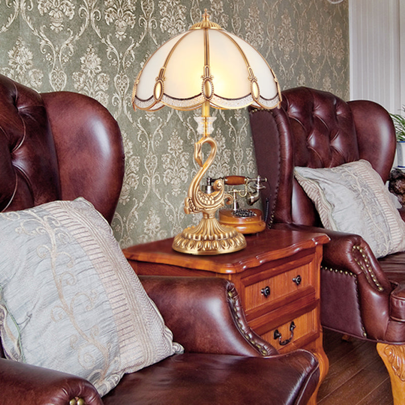 Classic Dome Table Light 1 Head White Glass Night Stand Lamp with Bird Decoration in Brass