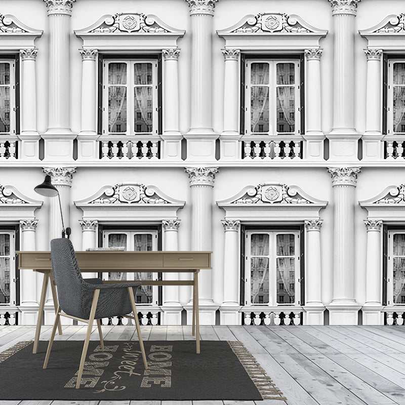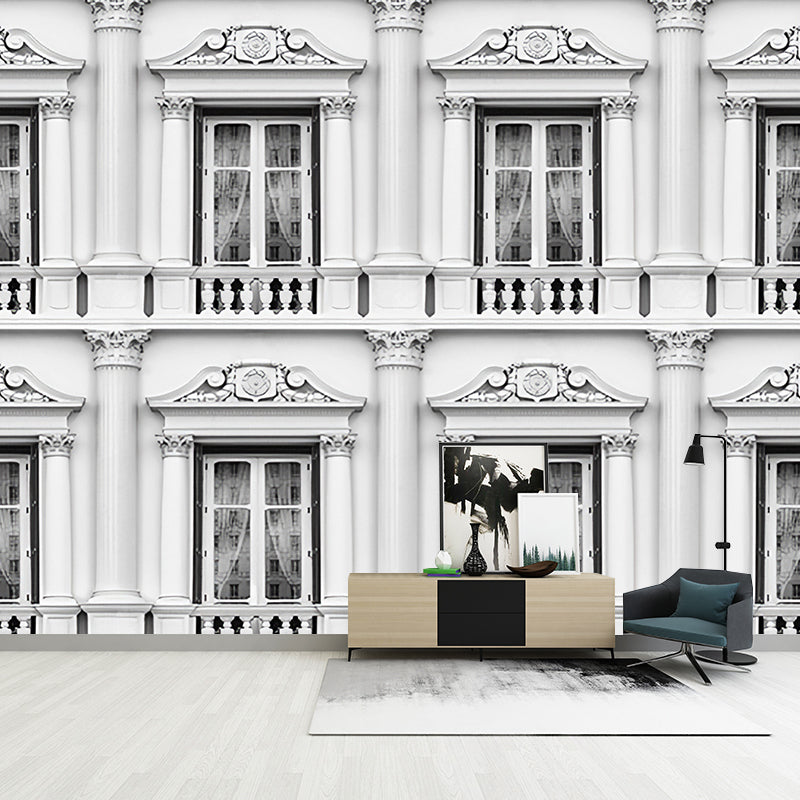 Full Size Wall Art Retro Window and Balcony of Romanian Style Mural Wallpaper in Grey and White Clearhalo 'Wall Decor' 'Wall Mural' 917077