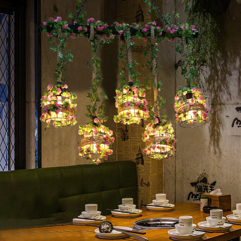 Black Cage Island Lighting Fixture Industrial Metal 5 Heads Restaurant Plant Ceiling Lamp