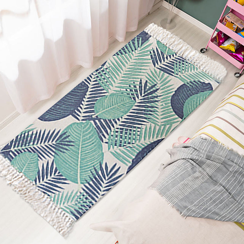 Tropical Leaf Pattern Rug Green Cotton Rug Non-Slip Pet Friendly Washable Carpet for Living Room